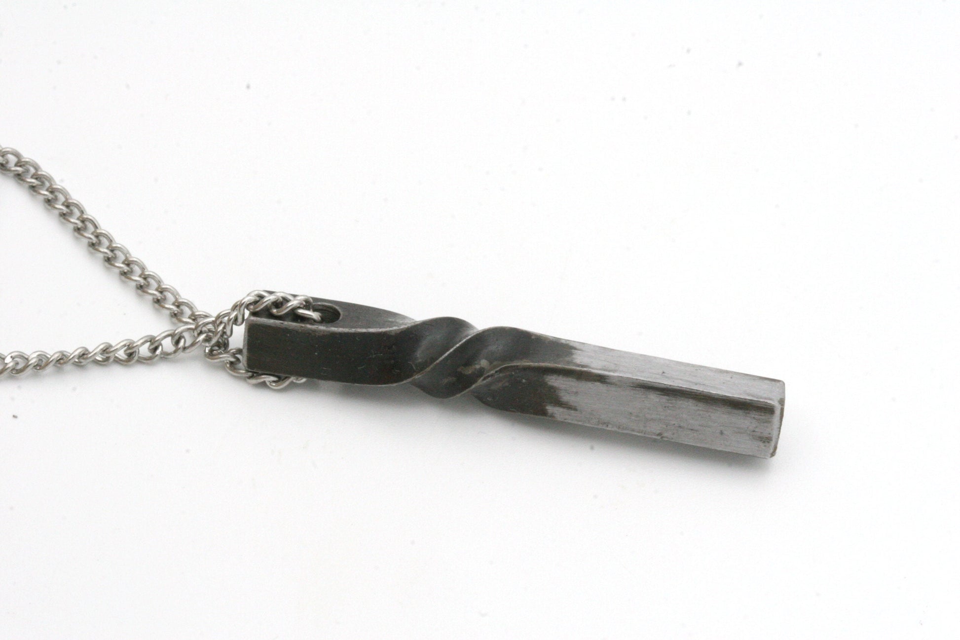 Made from solid iron, this pendant is drilled through the side to create a slider necklace. The pendant measure approximately 1 1/2 inches long.
