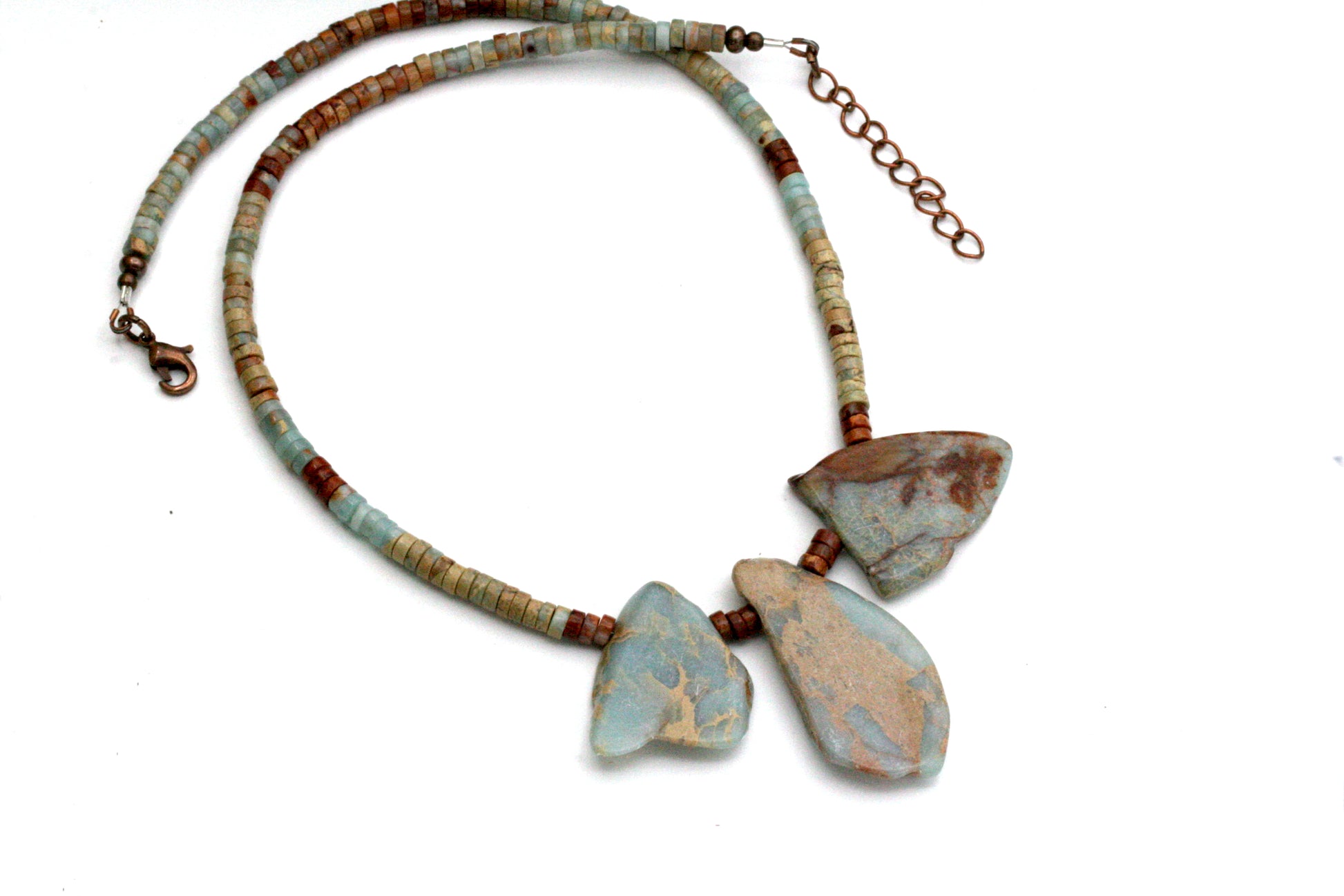 This handmade Aqua Terra jasper necklace blends earthy elegance with artisan detail. The centerpiece features three polished slab stones framed by colorful heishi beads arranged in distinct sections, giving the necklace a natural yet vibrant style. Antiqued copper accents add warmth and character, making it a versatile piece for casual wear or a unique statement accessory.