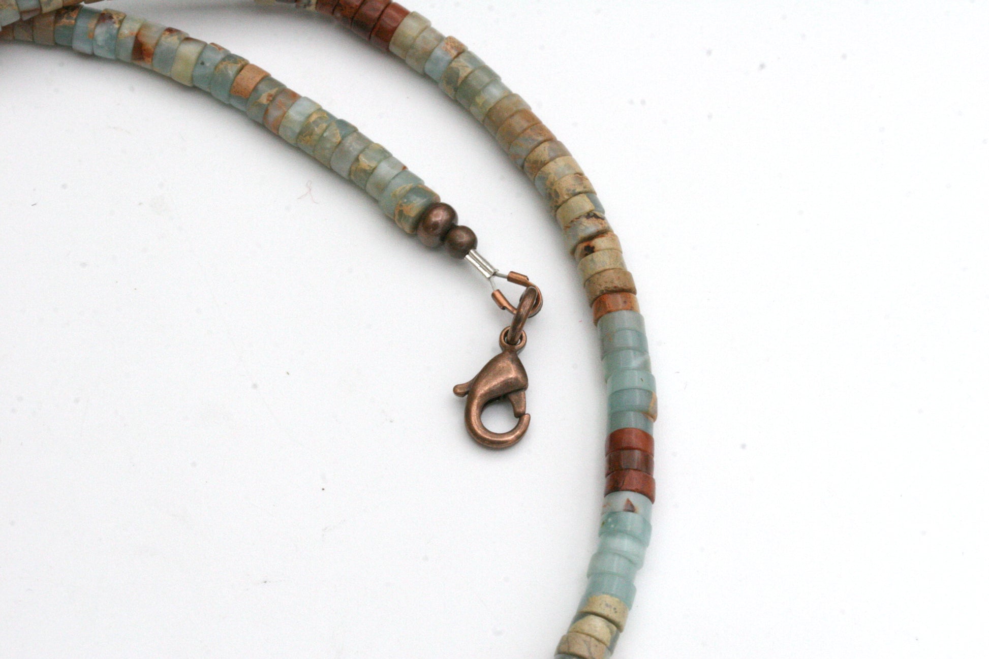 Aqua Terra Jasper Necklace: Slab Stone, Heishi Beads, Antiqued Copper