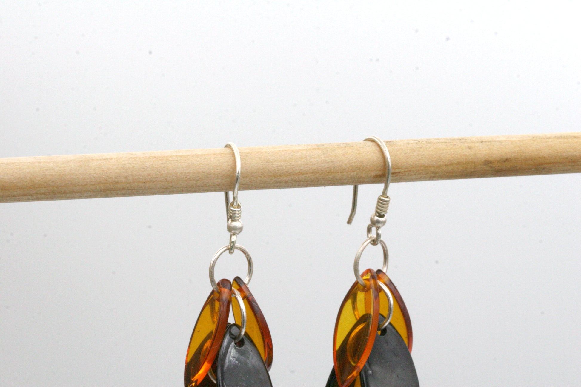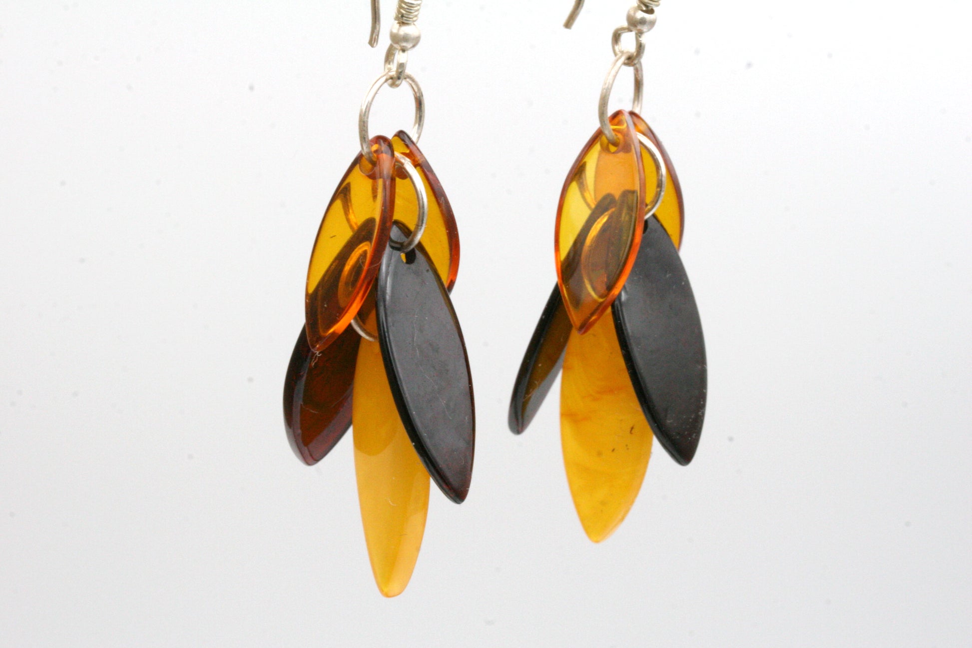 These handcrafted Baltic amber earrings feature beautiful leaf-shaped pieces of genuine amber in a natural cascade design. Each amber leaf is heat treated to create rich color variations ranging from golden yellow to deep honey brown, giving every pair its own unique glow.