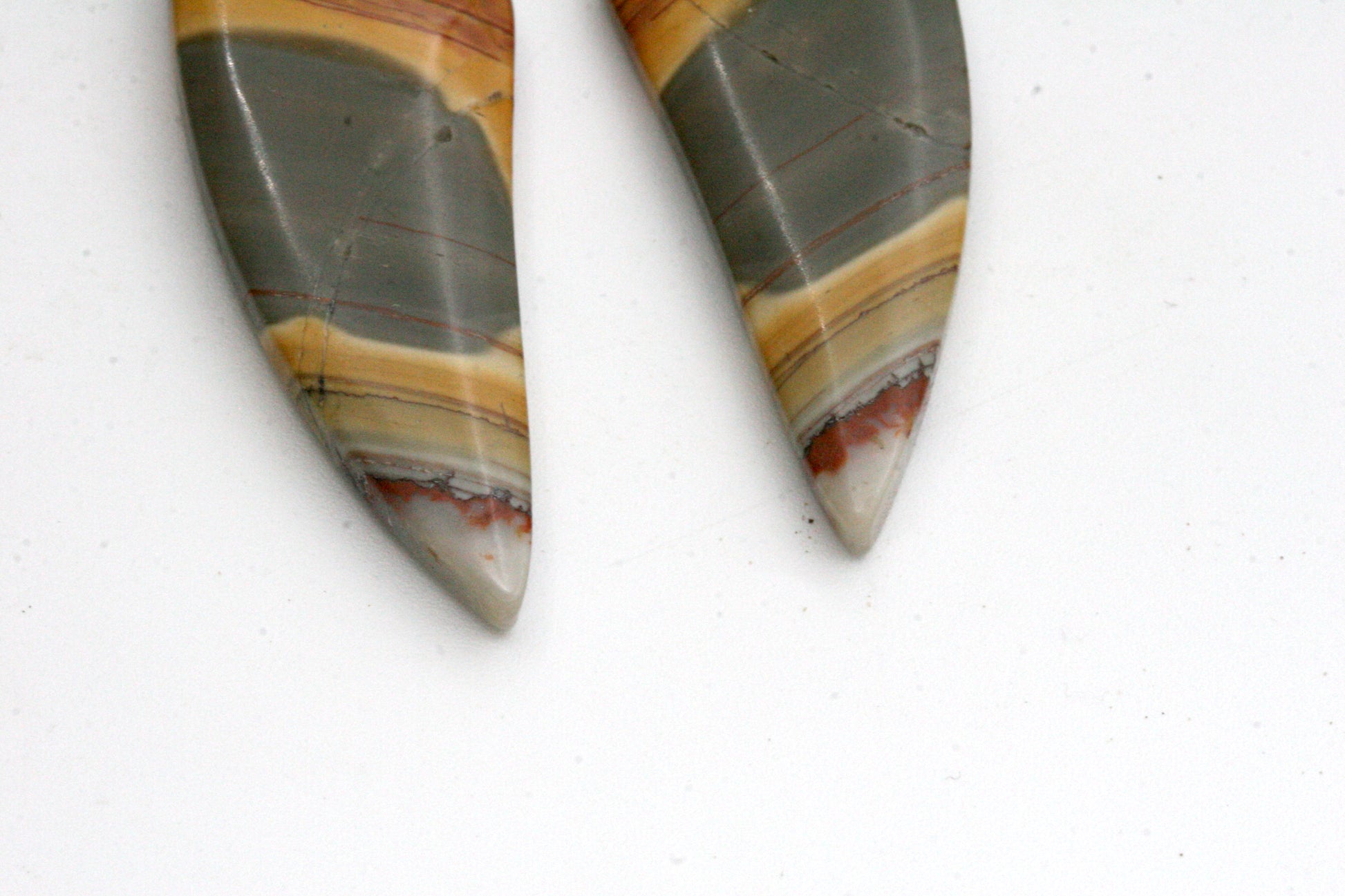 This is a one of a kind stone set, the stunning, warm earthy colors and veining pattern make these natural stones a unique piece of art. The total hanging length is about 2 1/2”