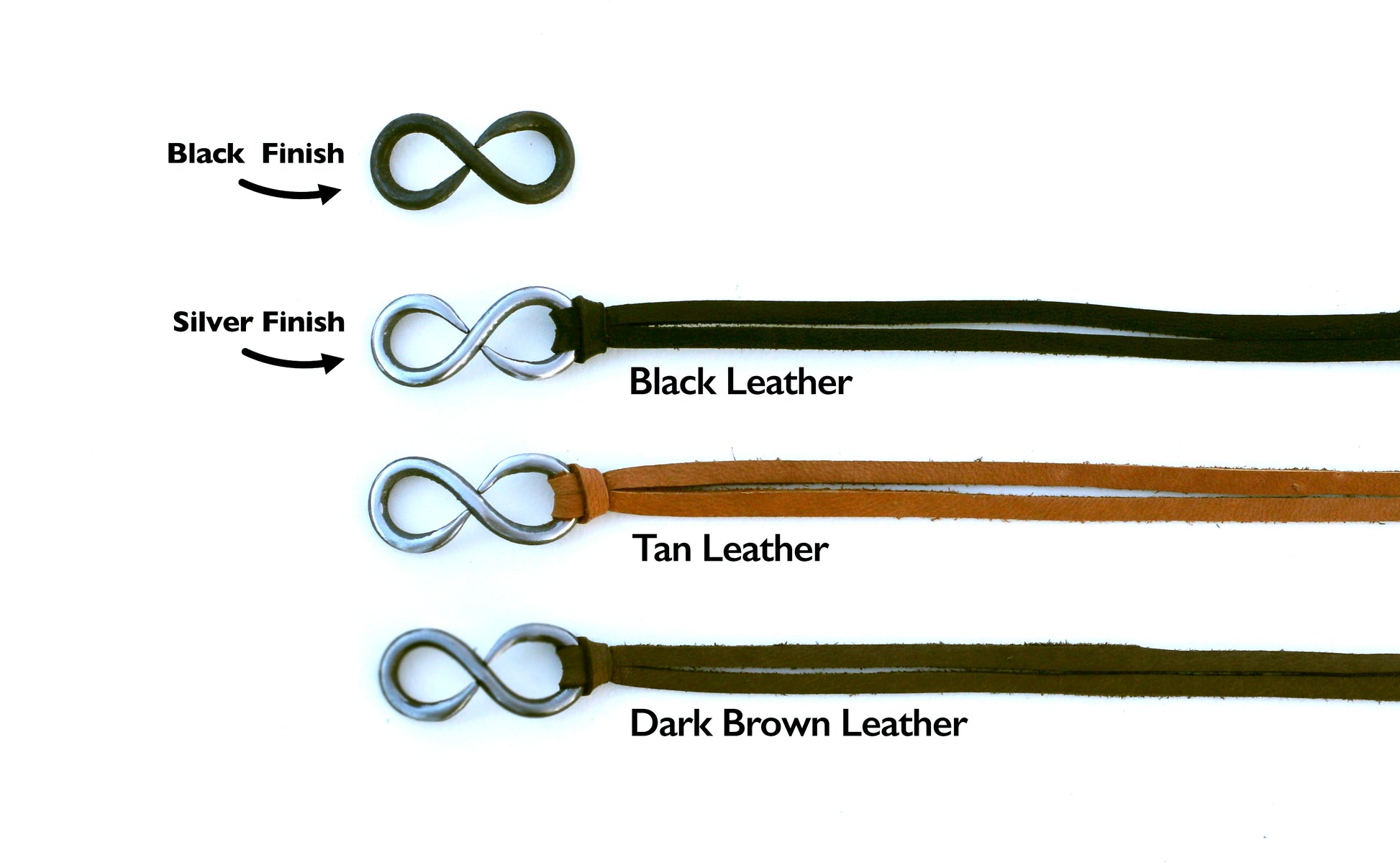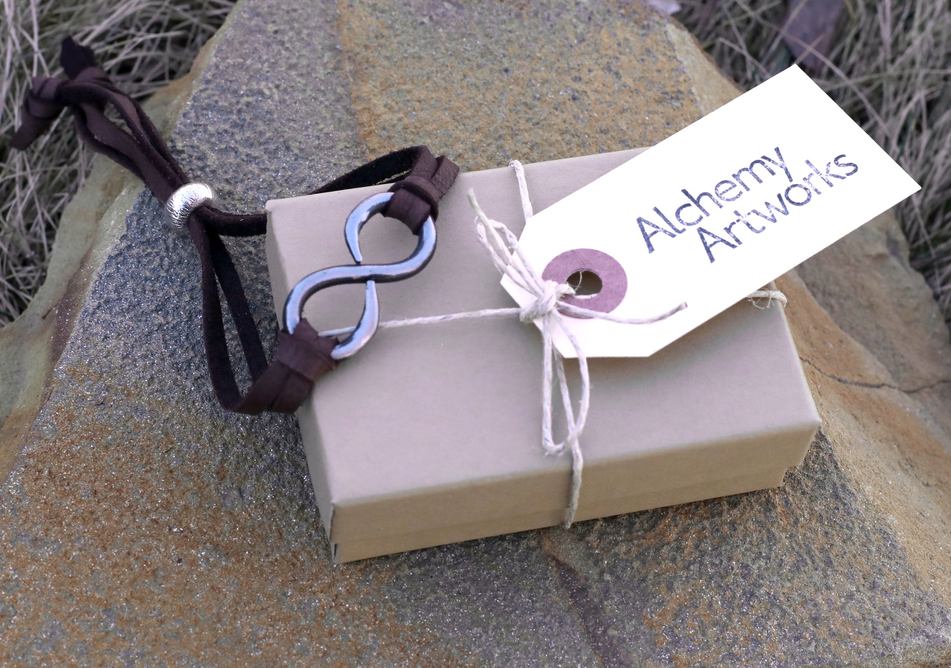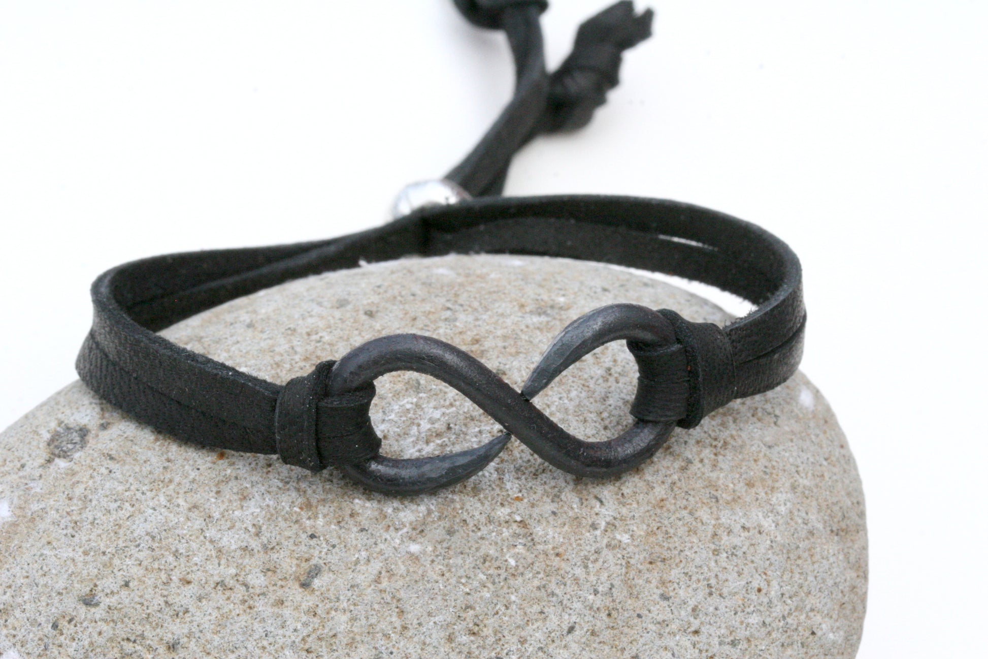 My hand forged infinity bracelet is made from solid iron and finished off with soft, dark brown, deerskin lace and an antiqued silver colored bead. This adjustable size bracelet fits anyone and makes a great gift for both men or women!