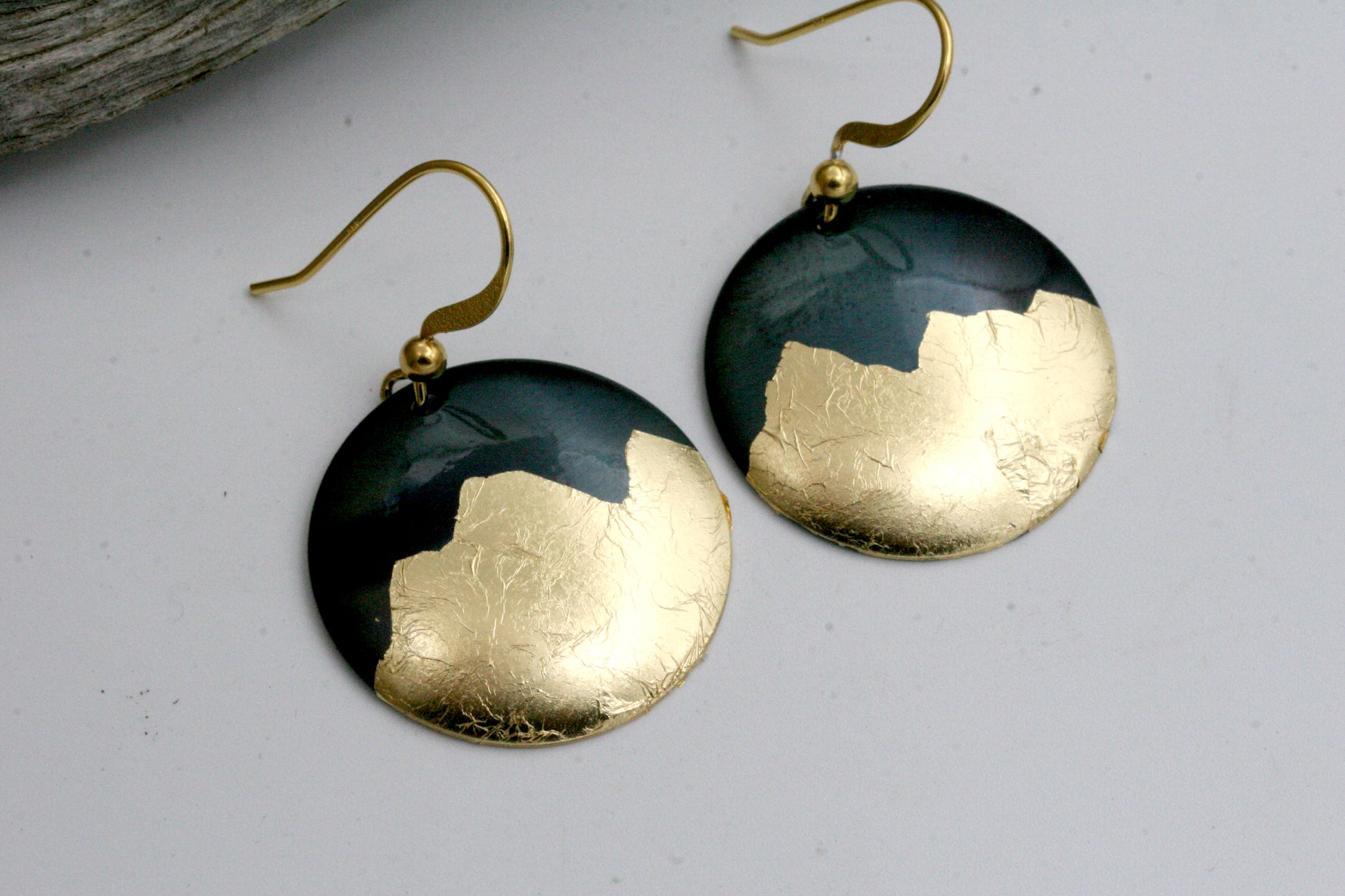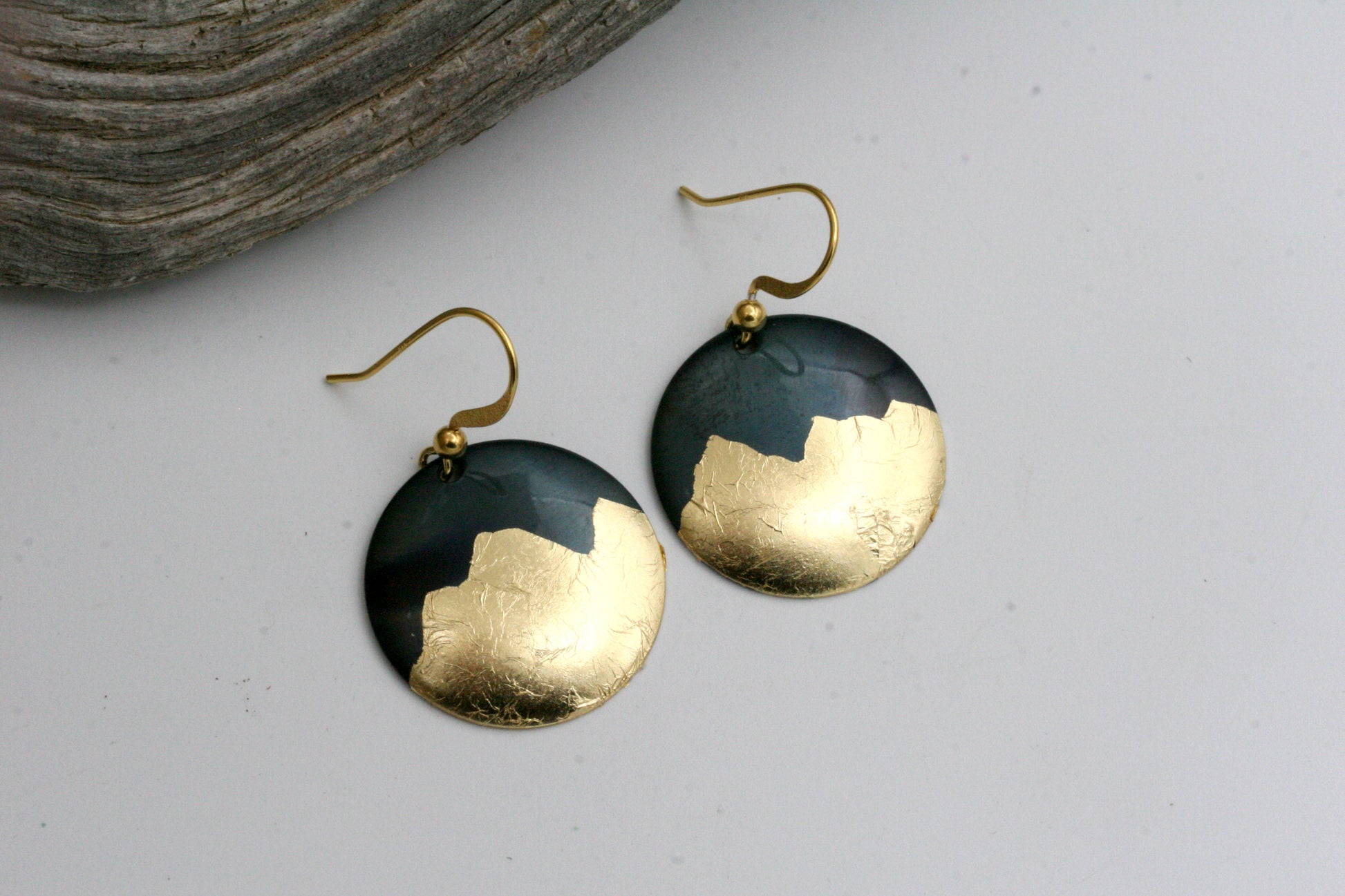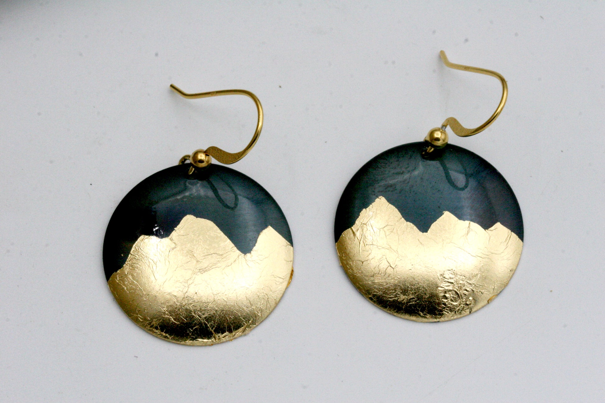 These earrings are created from iron disks which are carefully hammered into a dome shape. I then delicately apply gold foil to create a striking contrast in metals. These are one-of-kind and each earring will have its own characteristics. The ear wires are 14 Karat gold filled.