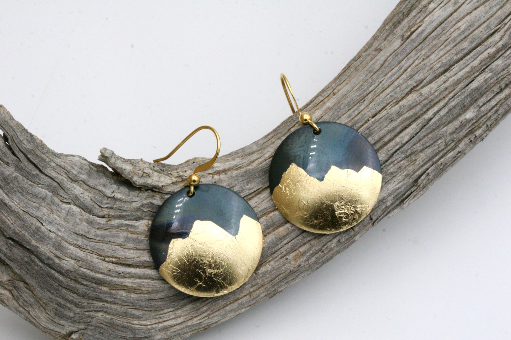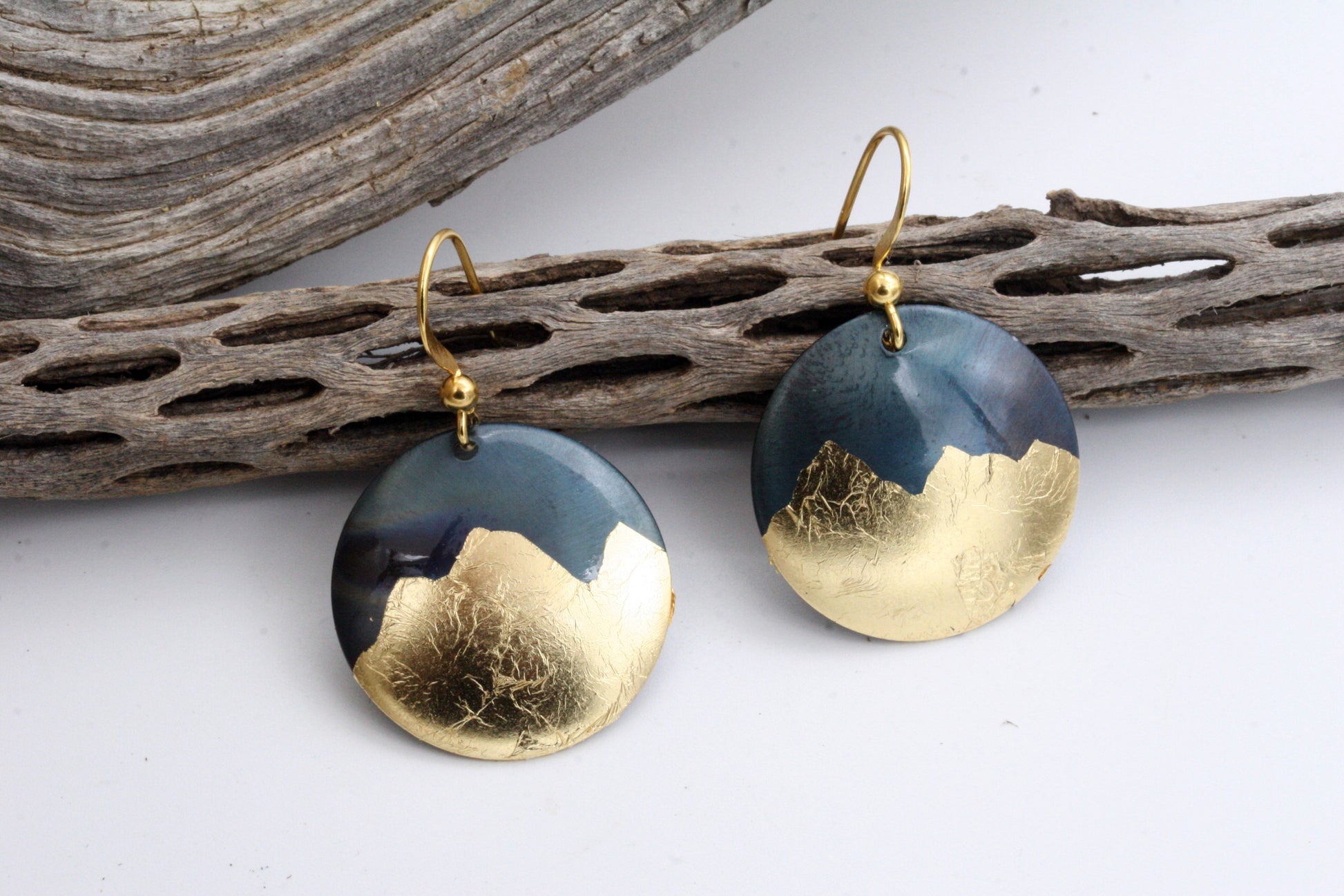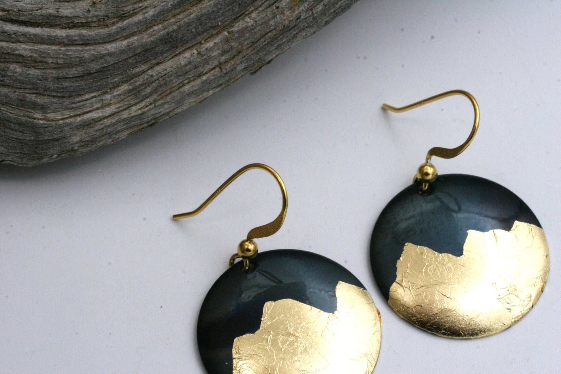 These earrings are created from iron disks which are carefully hammered into a dome shape. I then delicately apply gold foil to create a striking contrast in metals. These are one-of-kind and each earring will have its own characteristics. The ear wires are 14 Karat gold filled.