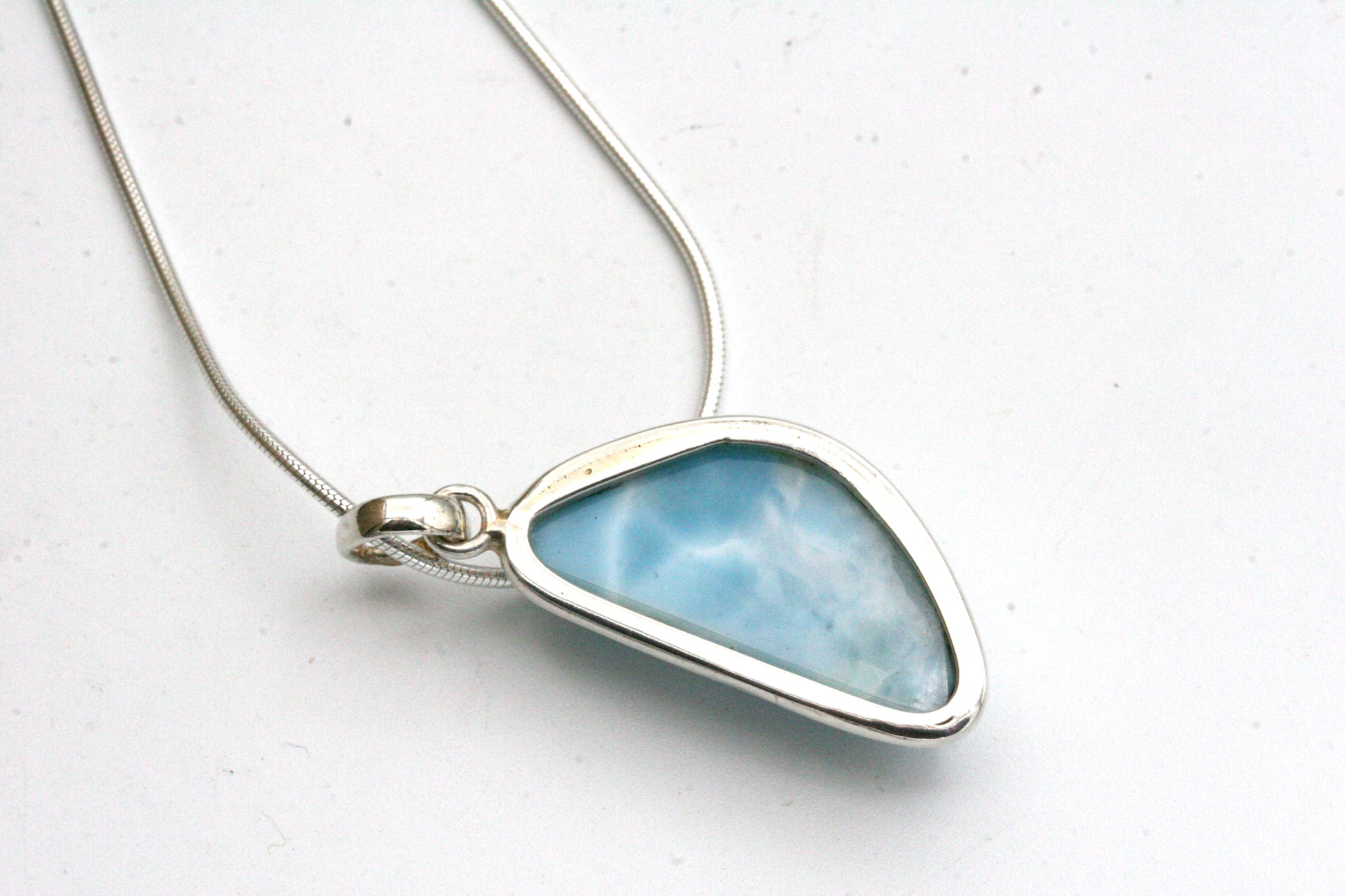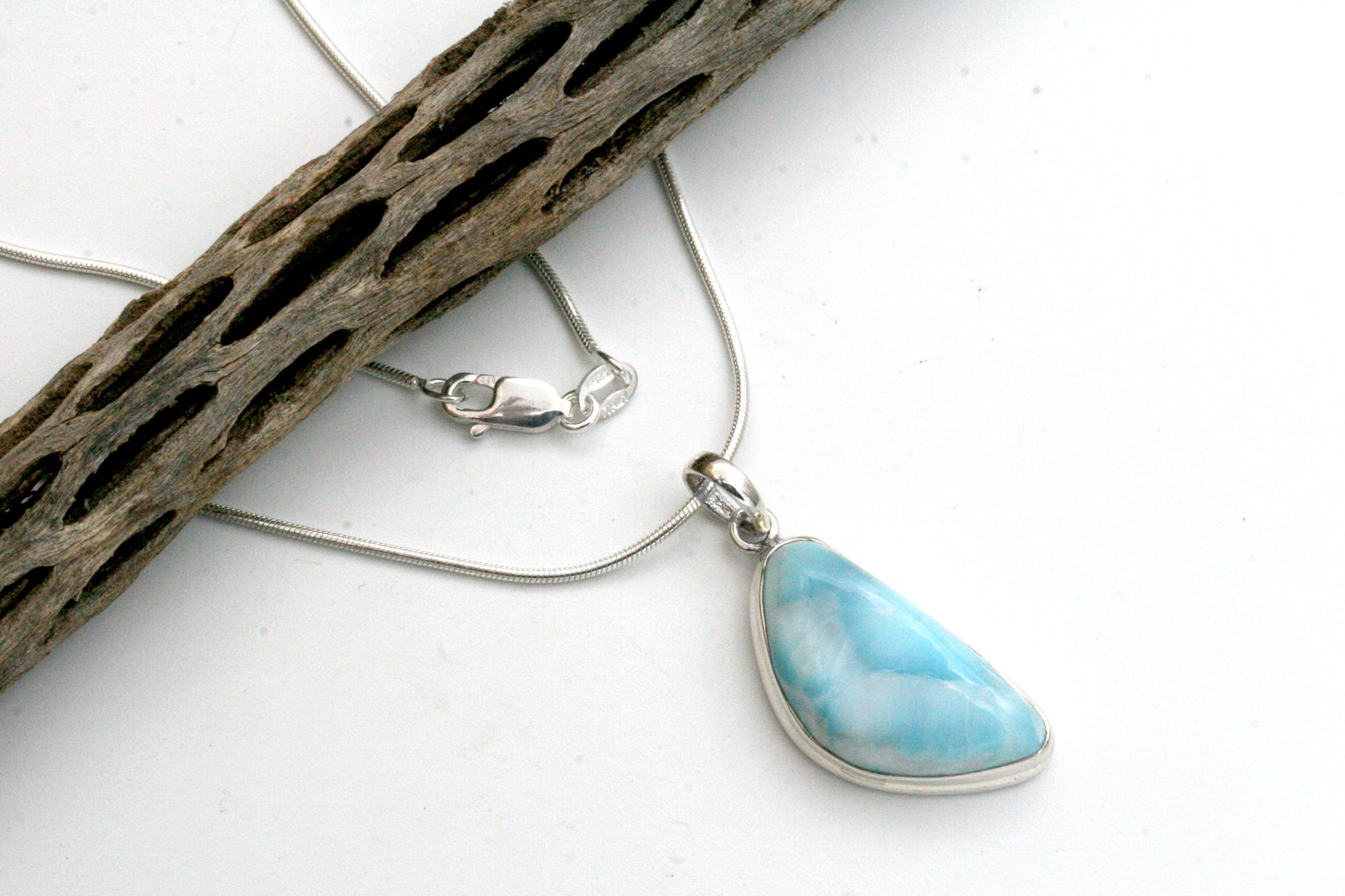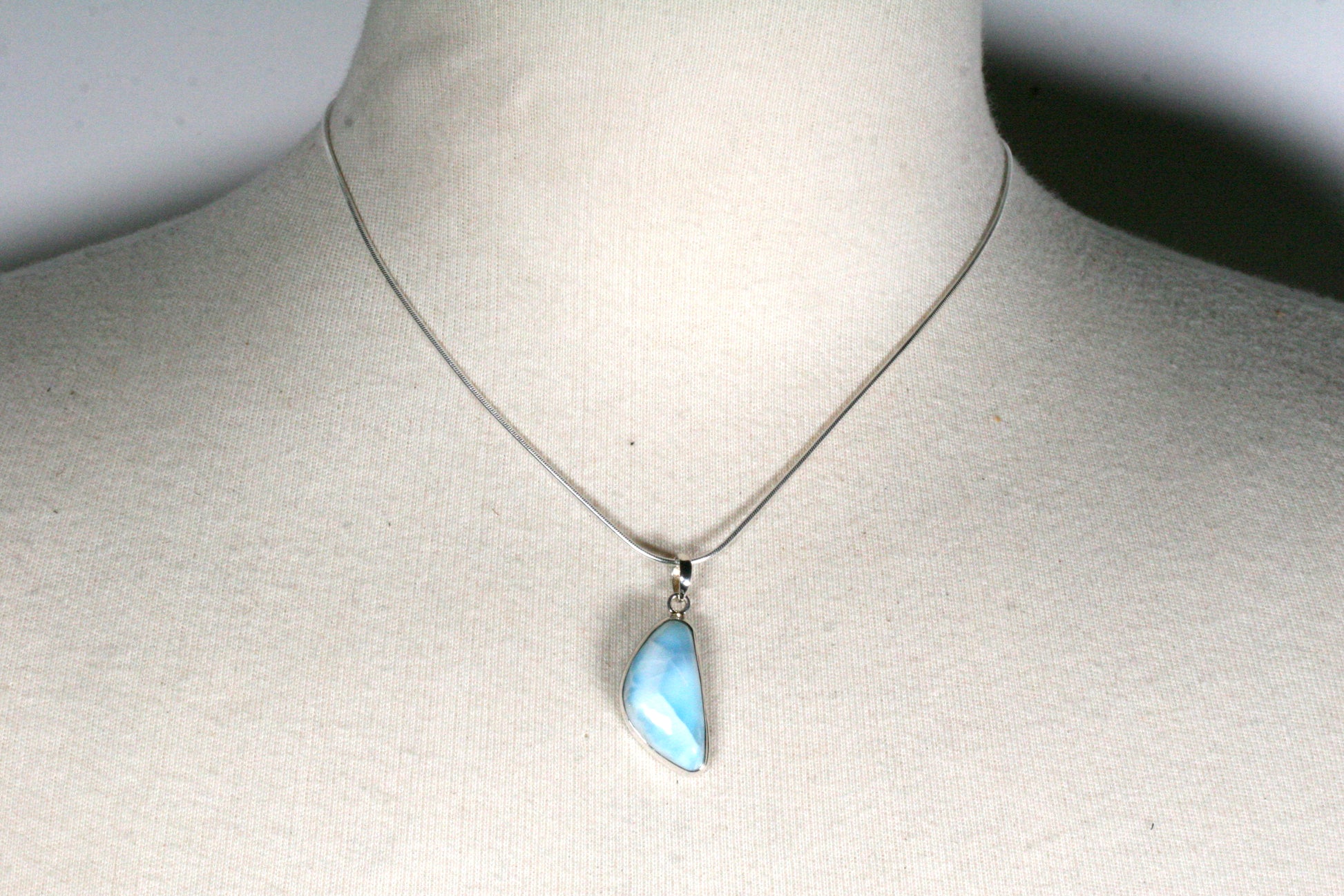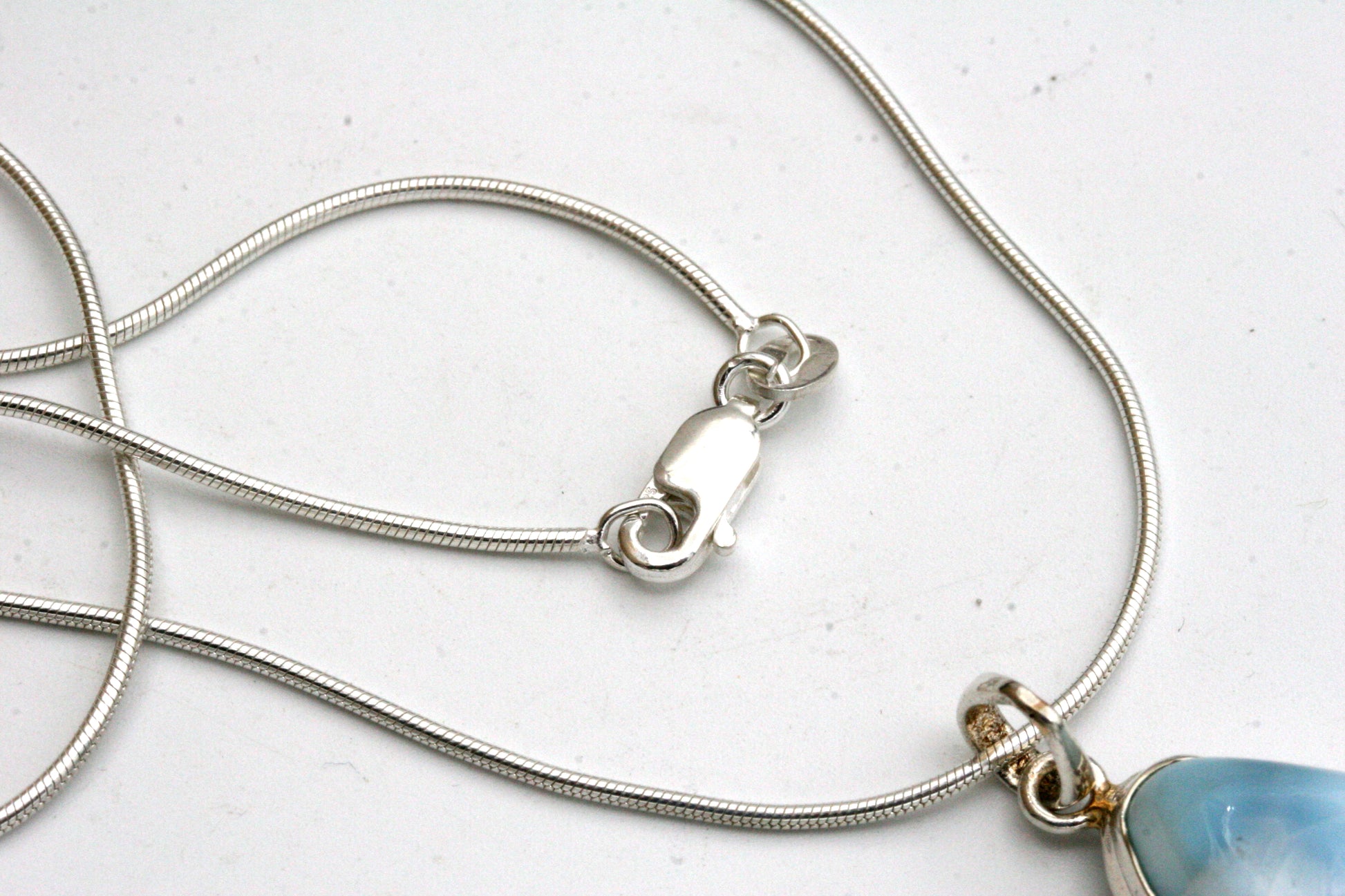 This handmade Larimar pendant necklace features a genuine freeform blue Larimar stone set in sterling silver with a snake chain in your choice of 16, 18, or 20 inches.