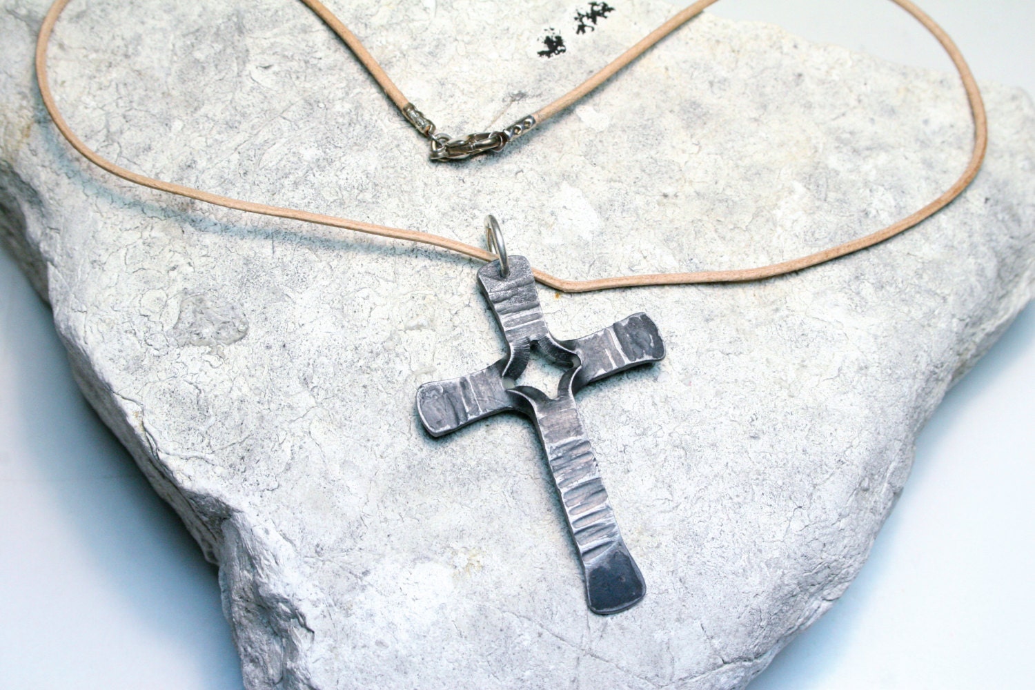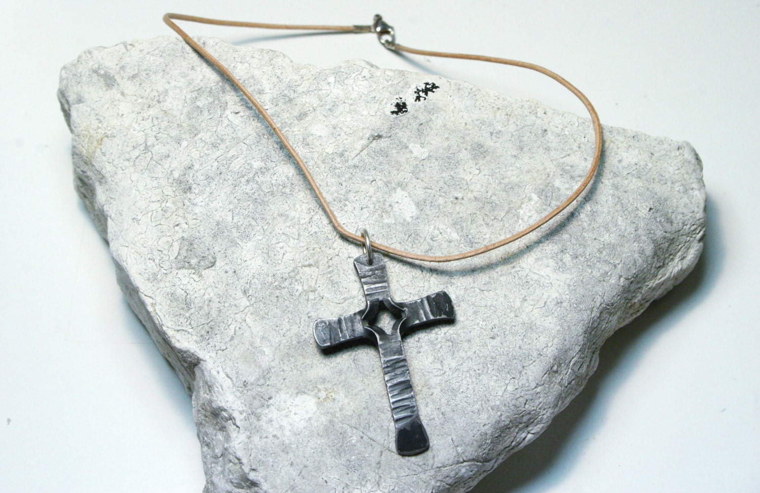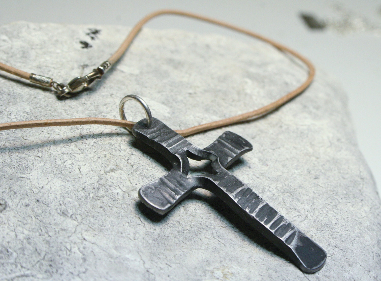 My blacksmith made cross necklace is hung from a soft greek leather cord and features a unique center twist. Each cross is completely handmade by me in a coal forge, shaped on the anvil, brushed, and finished with wax to add shine. These are a truly unique work of art and not mass produced.