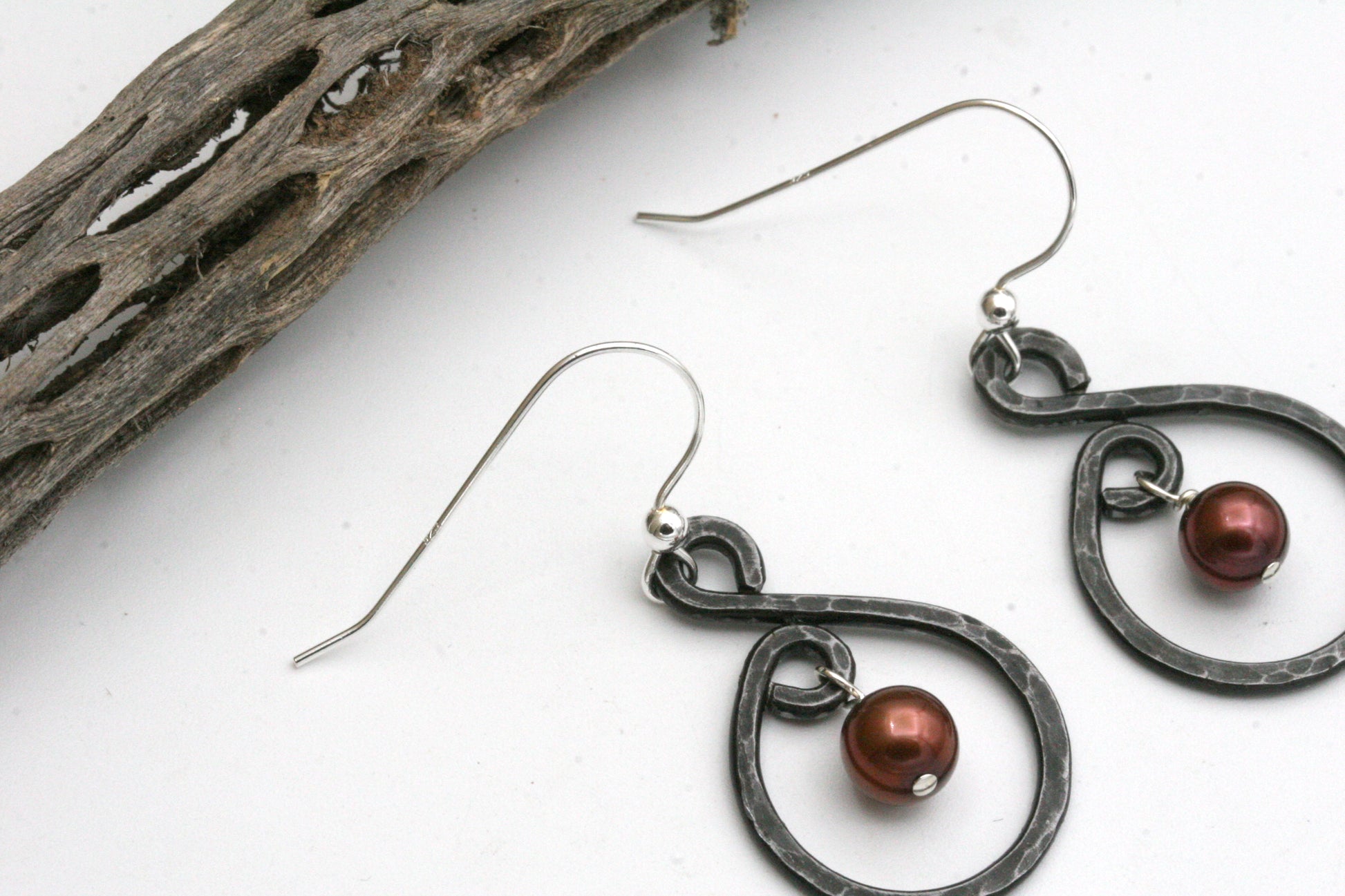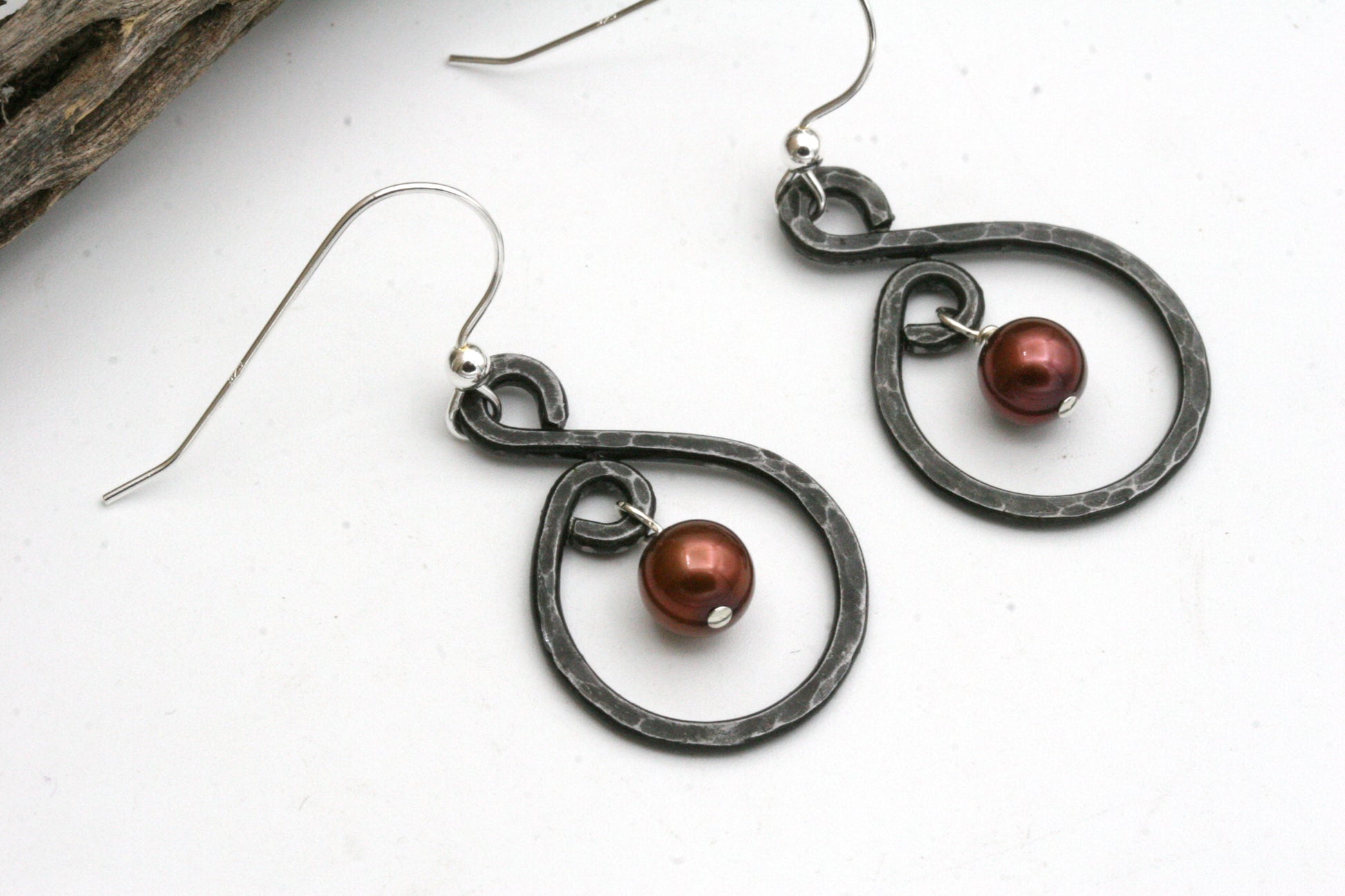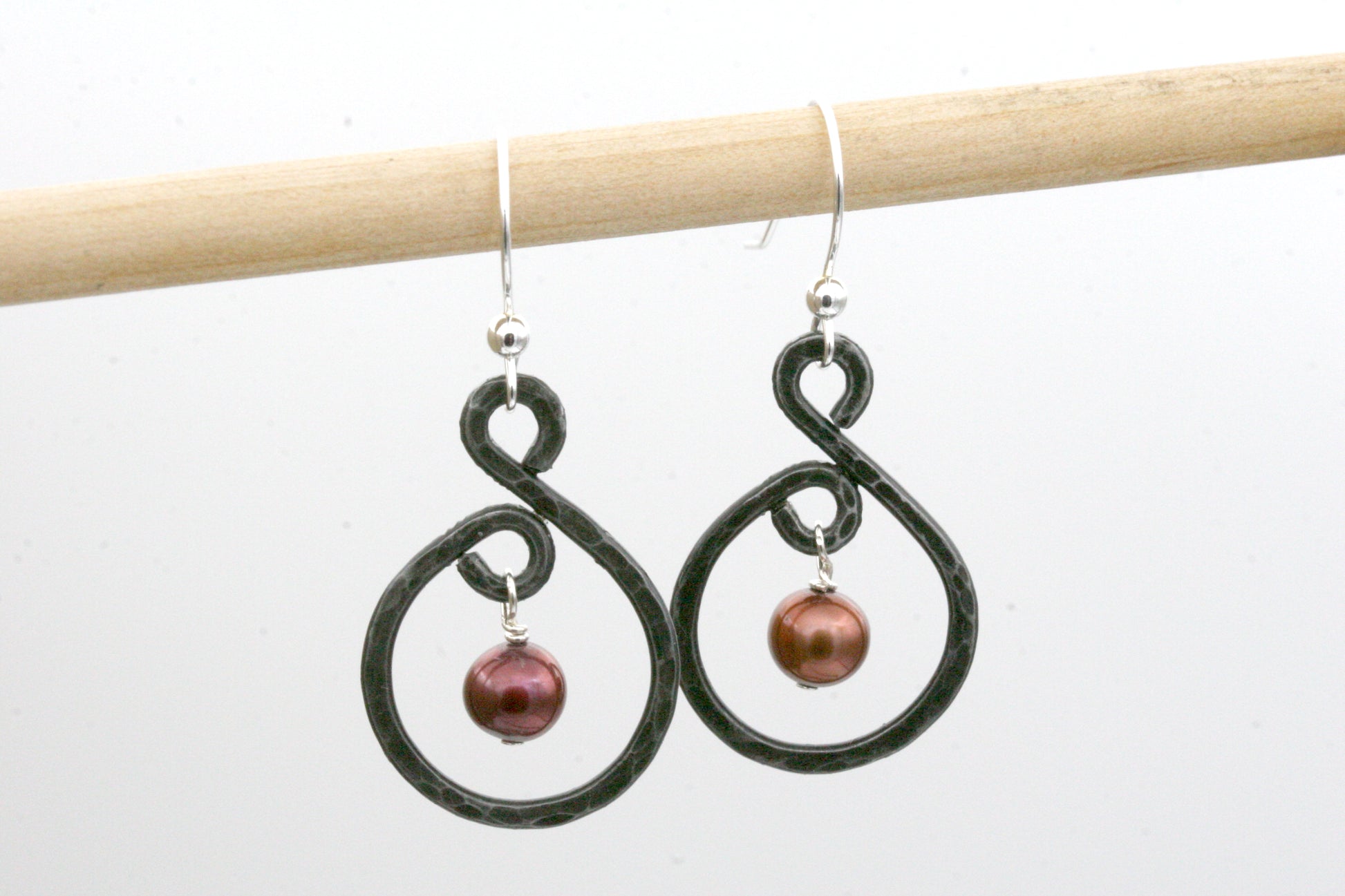 These small iron and pearl hoop earrings are truly unique! Each earring is handmade and textured with hammer marks, there will never be another pair exactly the same. Hung from the center is a wine color genuine pearl.
