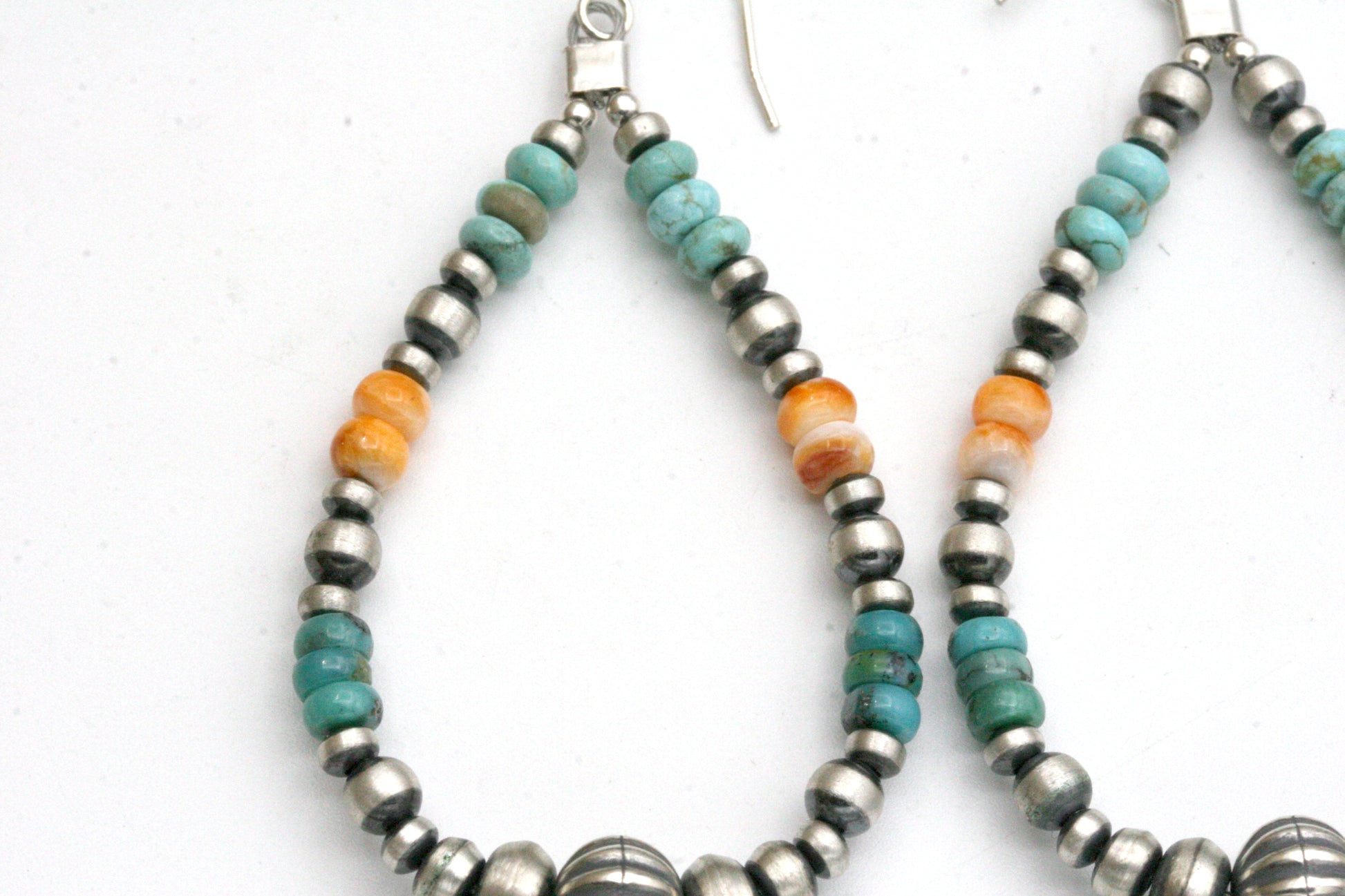 These handcrafted teardrop hoop earrings feature genuine Navajo pearls made from solid sterling silver, accented with vibrant turquoise and spiny oyster beads. The design blends classic Southwestern style with modern boho flair, creating a stunning statement piece that pairs beautifully with both casual and dressy looks.